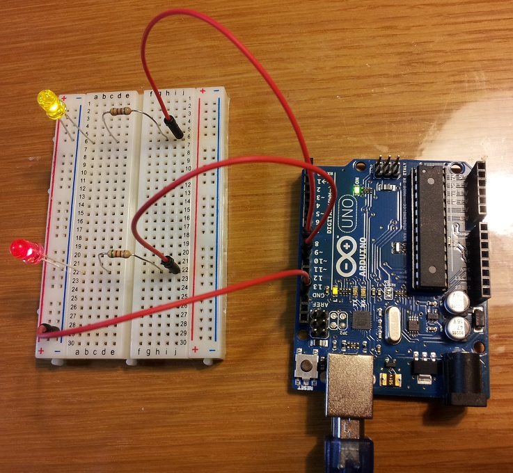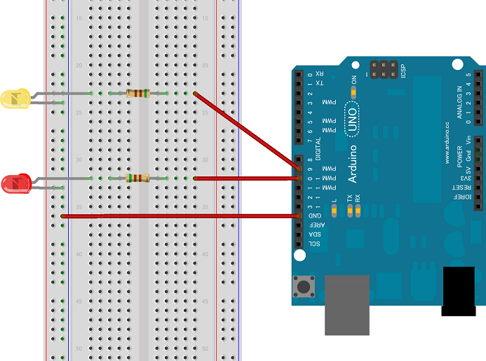 使用する部品は、Arduino Uno、LED x 2、抵抗510Ω x 2、ジャンパワイヤー3本。