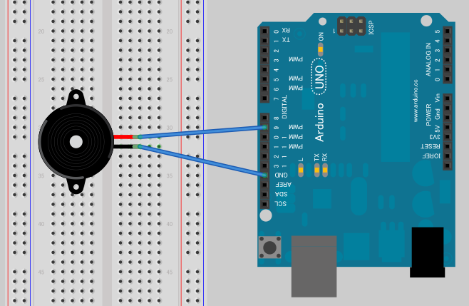 ArduinoのどれかのデジタルピンとGNDの間に圧電スピーカーを接続するだけの簡単な回路。