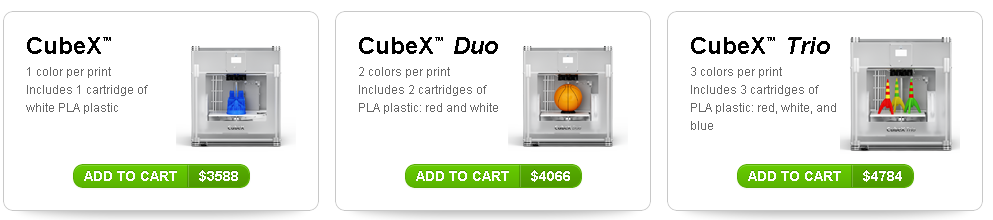 CubeX が単色、CubeX Duo が2色、CubeX Trioが3色同時に出力する事ができます。画像には値段(2013年2月時点)が載っています。画像をクリックすると大きくなります。