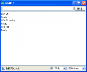 10回点滅中は、モニター LED Blinking と表示され、o や p などの処理は受け付けない点に注目。 点滅終了後は、 Ready が表示されコマンド受け付け可能になっている。