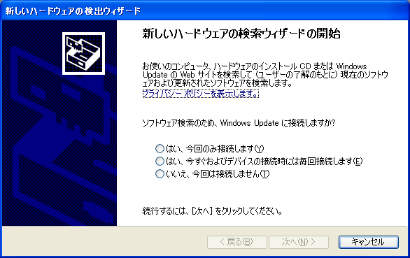 ⑥USBケーブルを繋げると以下の画面が出るので、“いいえ今回は接続しません(T)”を選択して、次の画面で、“一覧または特定の場所からインストールする”を選択して次へをクリックする。