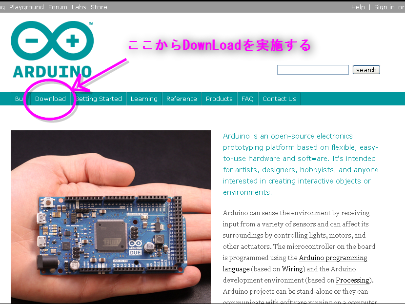 Arduinoの環境構築を行うという事で、①~⑨にそってソフトウェア、ドライバのインストールを行う。