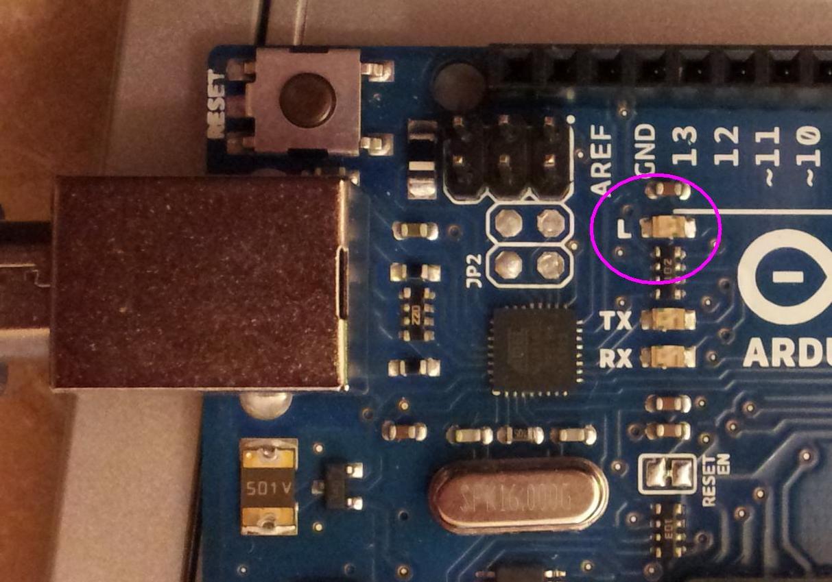 Arduinoには元々小さなLEDが搭載されている。以下の写真の丸印の部分。